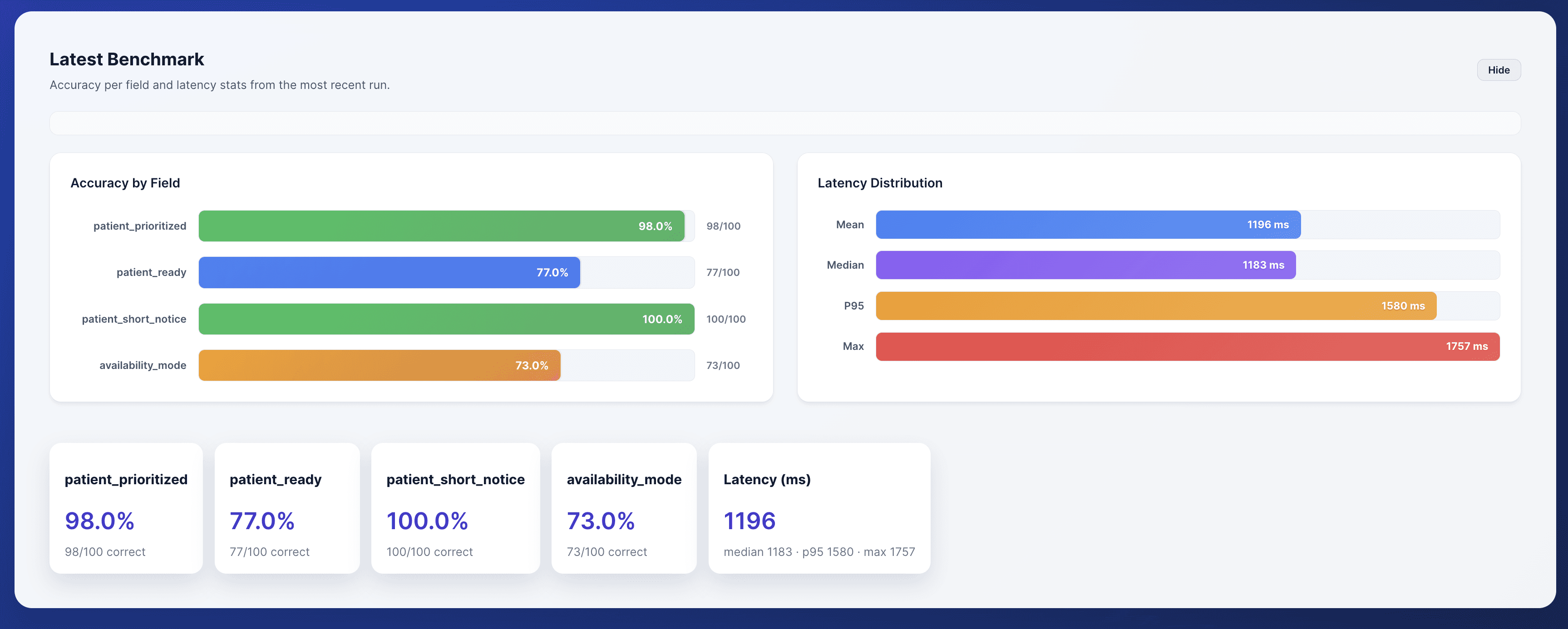 Figur 1: Skjermbilde fra intern applikasjon for modell-evaluering. Viser treffsikkerhet og ventetids-mål over pasient-statuser som er predikert av en LLM på syntetisk datasett som emulerer produksjonsdata.