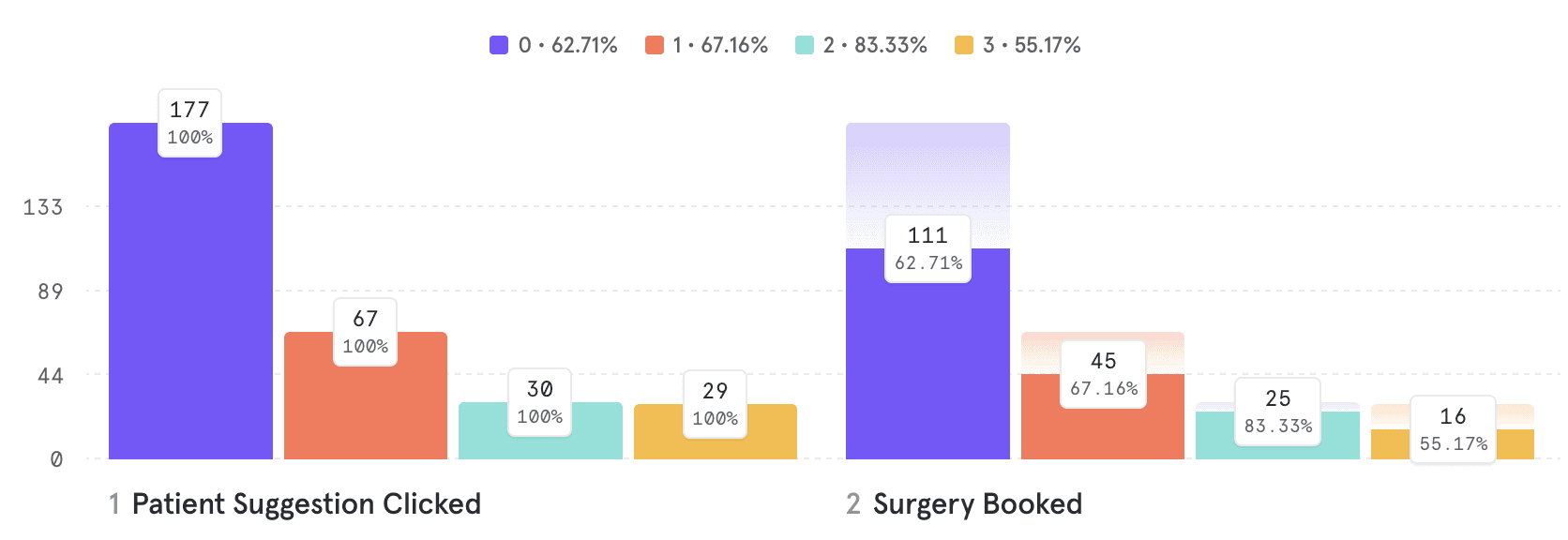 Figur 5: Konverteringsraten for de topp 4 foreslåtte pasientene over 30 dager. At et pasientforslag er klikket på kan i mange tilfeller være av årsaker som ikke er knyttet til booking, og den faktiske konverteringsraten fra pasientforslag til booking kan dermed være høyere.